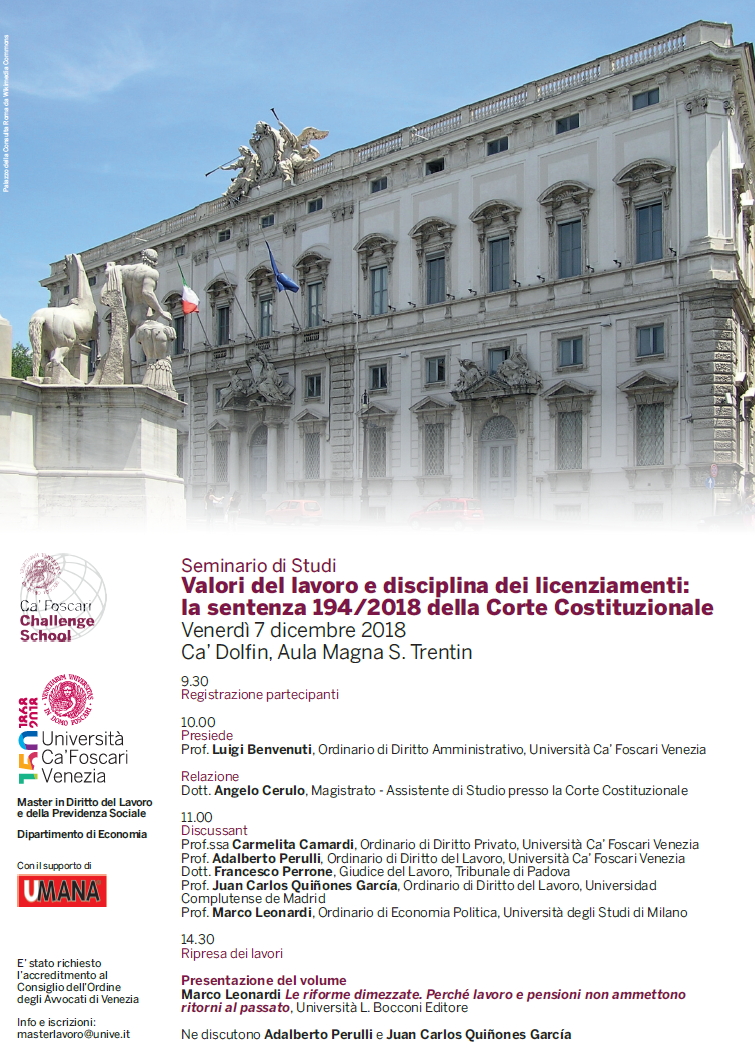 Da Ven, 07/12/2018 a Ven, 07/12/2018 Mode On-site-only 14/11/2022 VENEZIA - Valori del lavoro e disciplina dei licenziamenti: la sentenza 194/2018 della Corte Costituzionale on-site only | Aula Magna S. Trentin - ore 9.30