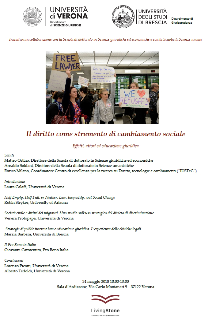 Da Gio, 24/05/2018 a Gio, 24/05/2018 Mode On-site-only 14/11/2022 VERONA - Il diritto come strumento di cambiamento sociale | Effetti, attori ed educazione giuridica on-site only | Via Carlo Montanari, 9 - ore 10