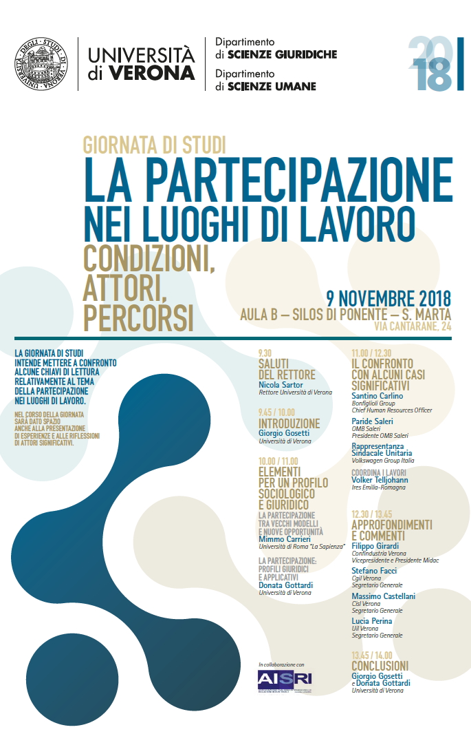 Da Ven, 09/11/2018 a Ven, 09/11/2018 Mode On-site-only 14/11/2022 VERONA - La partecipazione nei luoghi di lavoro. Condizioni, attori, percorsi on-site only | Via Cantarane, 24 - ore 9.30