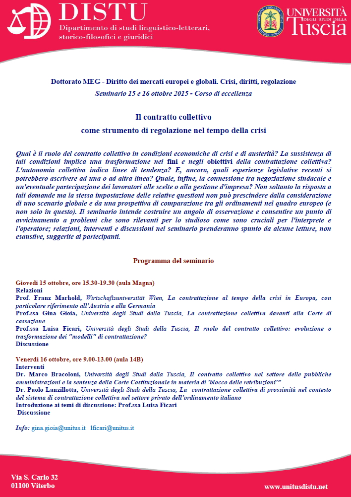 Da Gio, 15/10/2015 a Gio, 15/10/2015 Mode On-site-only 14/11/2022 VITERBO - Il contratto collettivo come strumento di regolazione nel tempo della crisi (15-16 ottobre 2015) on-site only | Via S. Carlo, 32 - h. 15.30