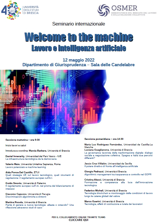 Da Gio, 12/05/2022 a Gio, 12/05/2022 Mode Hybrid File (download locandina)155.46 KB 09/05/2022 Welcome to the machine. Lavoro e intelligenza artificiale hybrid h. 9.30 PER IL COLLEGAMENTO ONLINE TRAMITE TEAMS CLICCARE QUI