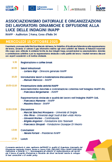 Il seminario, promosso dalla Struttura Mercato del lavoro, ha l’obiettivo di focalizzare l’attenzione sulla rappresentanza del lavoro, cercando di colmare il gap informativo relativo agli attori collettivi del Sistema di Relazioni industriali. Allo scopo sono utilizzate le evidenze fornite da due indagini Inapp, concentrandosi su associazionismo datoriale e contrattazione collettiva e poi su rappresentanza sindacale e sulla qualità del lavoro. I risultati verranno discussi con esperti accademici e di matrice sindacale.