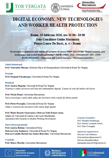 Da Mer, 25/02/2026 a Mer, 25/02/2026 Mode On-site-only File Programma425.36 KB 27/01/2026 Digital economy, new technologies and worker health protection on-site only h. 15:00 | Piazza Lauro De Bosis 4, Roma Foro Italico dell'Università di Roma Tor Vergata Sala Consiliare Giulio Marinozzi