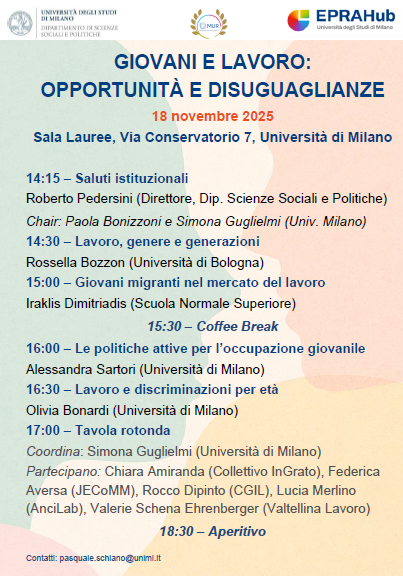 Da Mar, 18/11/2025 a Mar, 18/11/2025 Mode On-site-only File Programma295.01 KB 13/11/2025 Giovani e lavoro: opportunità e disuguaglianze on-site only h. 14:15 | Via Conservatorio 7, Milano Università di Milano Dipartimento di Scienze Politiche - Sala Lauree