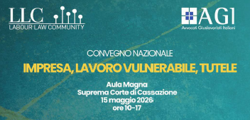 Da Ven, 15/05/2026 a Ven, 15/05/2026 Mode On-site-only File Programma356.02 KB 08/04/2026 Impresa, lavoro vulnerabile, tutele on-site only h. 10:00 | Piazza Cavour, Roma LLC - Labour Law Community, Comunità di giuslavoristi e AGI – Avvocati Giuslavoristi Italiani Suprema Corte di Cassazione - Aula Magna