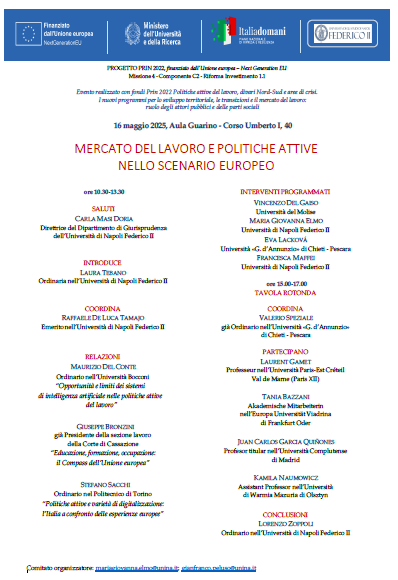 Da Ven, 16/05/2025 a Ven, 16/05/2025 Mode On-site-only File Programma468.86 KB 07/05/2025 Mercato del lavoro e politiche attive nello scenario europeo on-site only h. 10:30 | Corso Umberto I 40, Napoli Università degli studi di Napoli Federico Aula Guarino - Dipartimento di Giurisprudenza