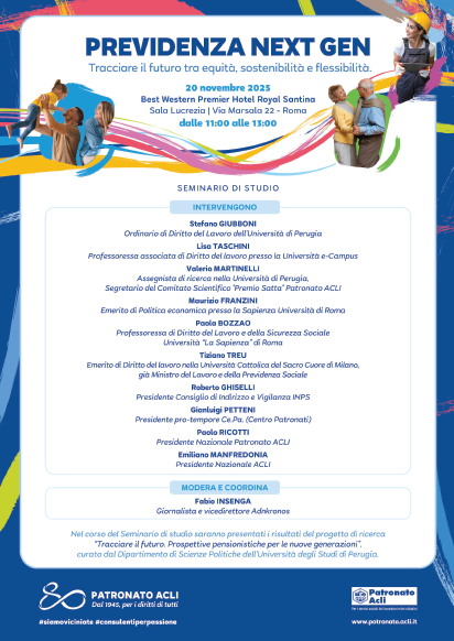 Da Gio, 20/11/2025 a Gio, 20/11/2025 Mode On-site-only File Programma865.09 KB 17/11/2025 Previdenza Nex Gen. Tracciare il futuro tra equità, sostenibilità e flessibilità on-site only h. 11 | Via Marsala 22, Roma Best Western Premier Hotel Royal Santina Sala Lucrezia