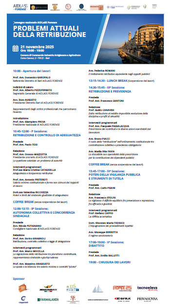 Da Ven, 21/11/2025 a Ven, 21/11/2025 Mode On-site-only File Programma618.46 KB 16/10/2025 Problemi attuali della retribuzione on-site only h. 10:00 | Corso Cavour 2, Bari Convegno nazionale AIDLaSS Forense Camera di Commercio Industria Artigianato e Agricoltura