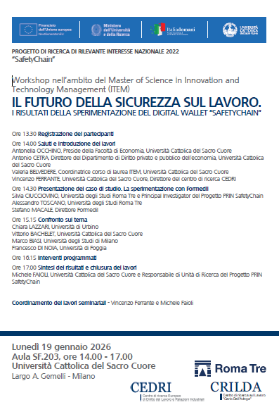 Da Lun, 19/01/2026 a Lun, 19/01/2026 Mode On-site-only File Programma196.18 KB 17/12/2025 Il futuro della sicurezza sul lavoro. I risultati della sperimentazione del Digital Wallet “SAFETYCHAIN” on-site only h. 14 | Largo A. Gemelli 1, Milano Università Cattolica del Sacro Cuore Aula SF.203
