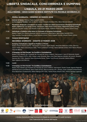 Da Ven, 20/03/2026 a Sab, 21/03/2026 Mode On-site-only File Programma277.27 KB 18/02/2026 Libertà sindacale, concorrenza e dumping on-site only h. 15:00 | 20-21 marzo 2026 - Via Michele Iacobucci 6, L'Aquila Aula Magna - Gran Sasso Science Institute