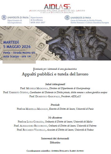 Da Mar, 05/05/2026 a Mar, 05/05/2026 Mode Hybrid File Programma1.26 MB 31/03/2026 Appalti pubblici e tutela del lavoro hybrid h. 14 Università di Pavia Dipartimento di Giurisprudenza - Aula Scarpa Strada Nuova 65, Pavia Da remoto: link presto disponibile
