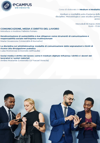 Da Mer, 18/03/2026 a Mer, 18/03/2026 Mode Online-only File Programma171.09 KB 03/02/2026 Comunicazione, media e diritto del lavoro online only h. 15 Università eCampus Dottorato multidisciplinare in Medium e Medialità Per il collegamento da remoto scrivere a fabrizio.ferraro@uniecampus.it