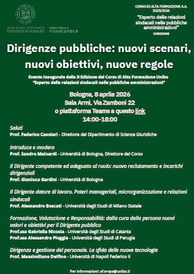 Da Mer, 08/04/2026 a Mer, 08/04/2026 Mode Hybrid File Programma721.14 KB 13/02/2026 Dirigenze pubbliche: nuovi scenari, nuovi obiettivi, nuove regole hybrid h. 14 Alma Mater Studiorum - Università di Bologna Dipartimento di Scienze Giuridiche - Sala delle Armi Via Zamboni, 22 Da remoto: LINK