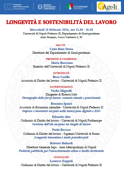 Da Mer, 18/02/2026 a Mer, 18/02/2026 Mode On-site-only File Programma1.05 MB 28/01/2026 Longevità e Sostenibilità del Lavoro on-site only h. 15:30 | Corso Umberto I 40, Napoli Università di Napoli Federico II Dipartimento di Giurisprudenza - Aula Guarino