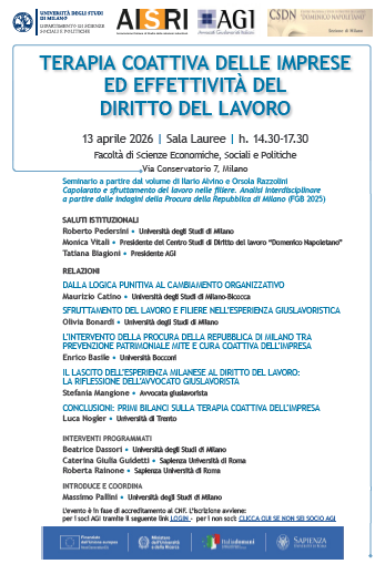 Da Lun, 13/04/2026 a Lun, 13/04/2026 Mode On-site-only File Programma325.69 KB 24/03/2026 Terapia coattiva delle imprese ed effettività del diritto del lavoro on-site only h. 14:30 | Via Conservatorio 7, Milano Università degli Studi di Milano Sala Lauree - Facoltà di Scienze Economiche, Sociali e Politiche