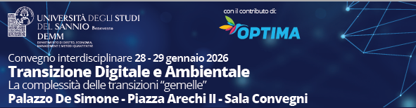 Da Mer, 28/01/2026 a Gio, 29/01/2026 Mode Online-only File Programma3.65 MB 23/01/2026 Transizione Digitale e Ambientale. La complessità delle transizioni gemelle on-site only | 28 e 29 gennaio 2026, Piazza Arechi II, Benevento Università del Sannio in Benevento Dipartimento DEMM - Palazzo De Simone